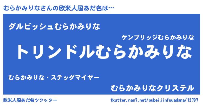 | 男性向けラノベタイトル風あだ名 | 『むらかみりな~年齢イコール彼女いない歴の魔法使い~』 |