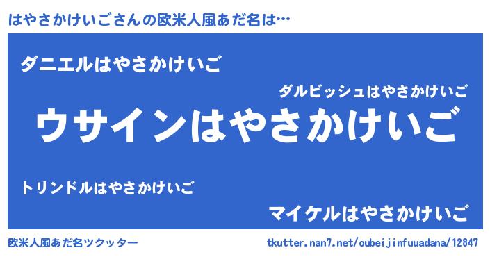 | 男性向けラノベタイトル風あだ名 | 『はやさかけいごの嫁は女の子じゃないと思った?』 |