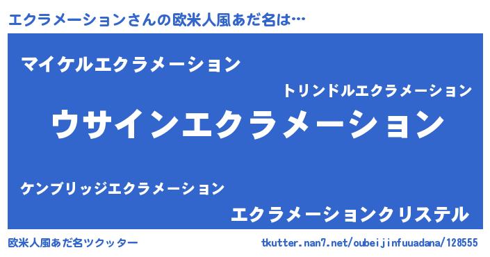 | 男性向けラノベタイトル風あだ名 | 『エクラメーションの嫁は女の子じゃないと思った?』 |