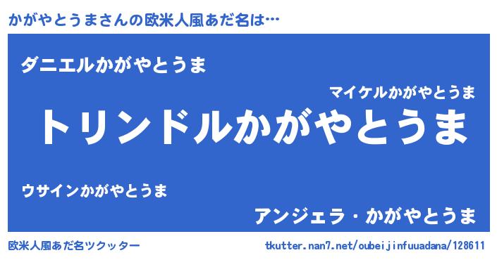 | 男性向けラノベタイトル風あだ名 | 『転生したらかがやとうまだった件』 |