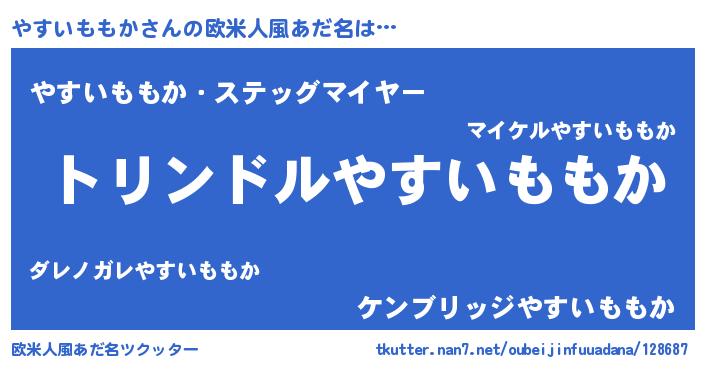 | 男性向けラノベタイトル風あだ名 | 『やすいももか~年齢イコール彼女いない歴の魔法使い~』 |
