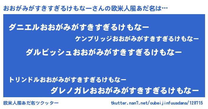 | ヘコむあだ名 | 『おおがみがすきすぎるけもなー(小並感)』 |