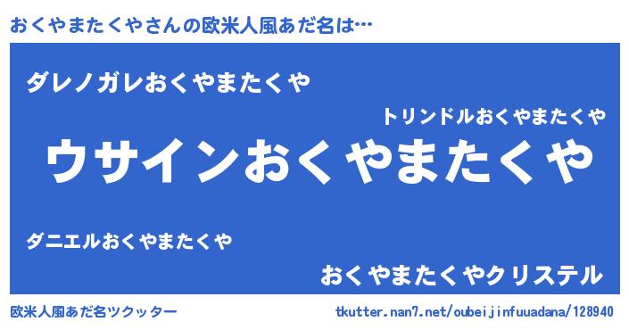 | 女子向けラノベタイトル風あだ名 | 『おくやまたくやの卵を拾いまして』 |