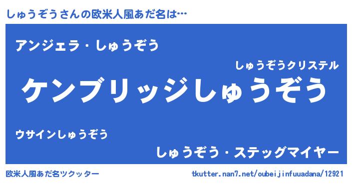 | 男性向けラノベタイトル風あだ名 | 『Re:しゅうぞうから始める異世界生活』 |