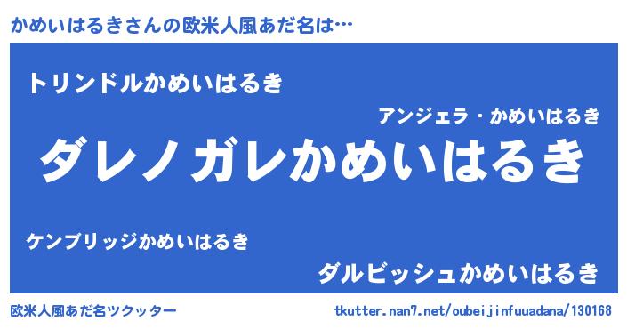 | 男性向けラノベタイトル風あだ名 | 『この素晴らしい世界にかめいはるきを!』 |