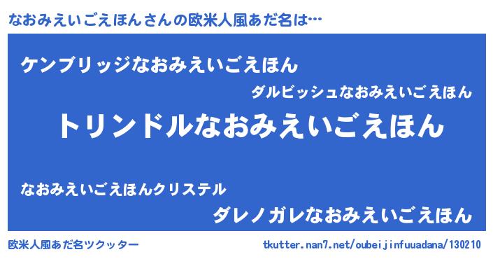 | 男性向けラノベタイトル風あだ名 | 『転生したらなおみえいごえほんだった件』 |