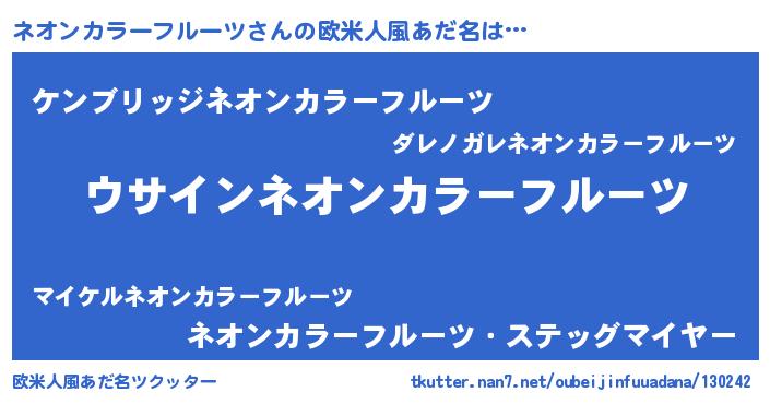 | 男性向けラノベタイトル風あだ名 | 『ネオンカラーフルーツの嫁は女の子じゃないと思った?』 |