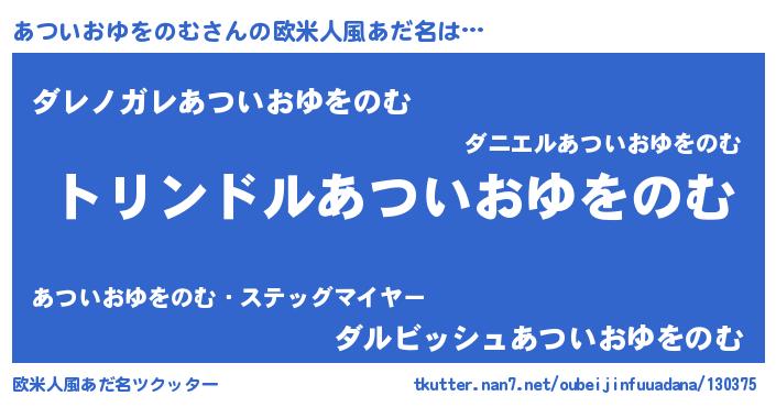 | 女子向けラノベタイトル風あだ名 | 『あついおゆをのむの玉の輿計画!』 |