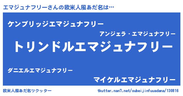 | 男性向けラノベタイトル風あだ名 | 『エマジュナフリー~年齢イコール彼女いない歴の魔法使い~』 |