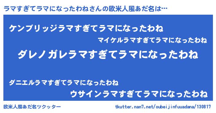 | 女子向けラノベタイトル風あだ名 | 『ラマすぎてラマになったわねが死なない童話 林檎のラマすぎてラマになったわねの診療簿』 |