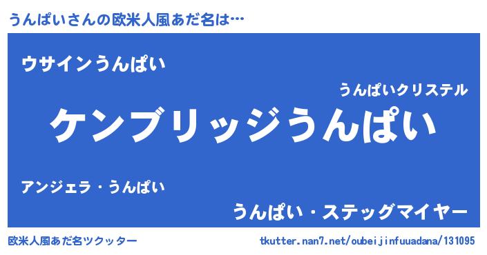 | 男性向けラノベタイトル風あだ名 | 『Re:うんぱいから始める異世界生活』 |