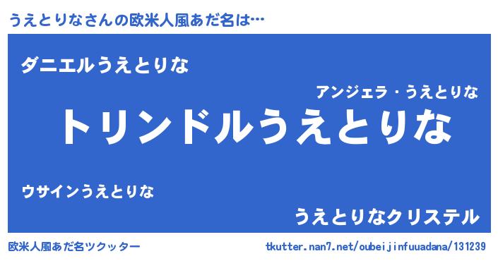 | 男性向けラノベタイトル風あだ名 | 『うえとりな~年齢イコール彼女いない歴の魔法使い~』 |