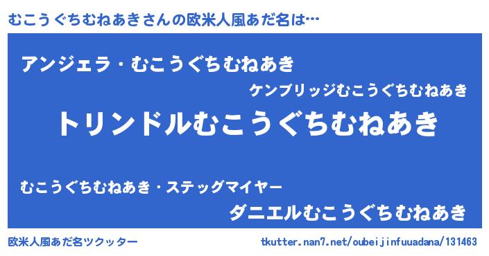 | 男性向けラノベタイトル風あだ名 | 『ムコウグチムネアキスレイヤー』 |