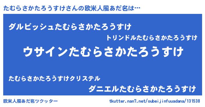 | 男性向けラノベタイトル風あだ名 | 『たむらさかたろうすけの嫁は女の子じゃないと思った?』 |