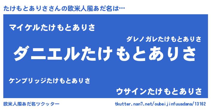 | 男性向けラノベタイトル風あだ名 | 『おまえをオタクにしてやるから、俺をたけもとありさにしてくれ! 』 |