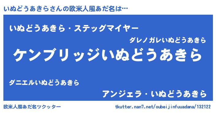 | 男性向けラノベタイトル風あだ名 | 『Re:いぬどうあきらから始める異世界生活』 |