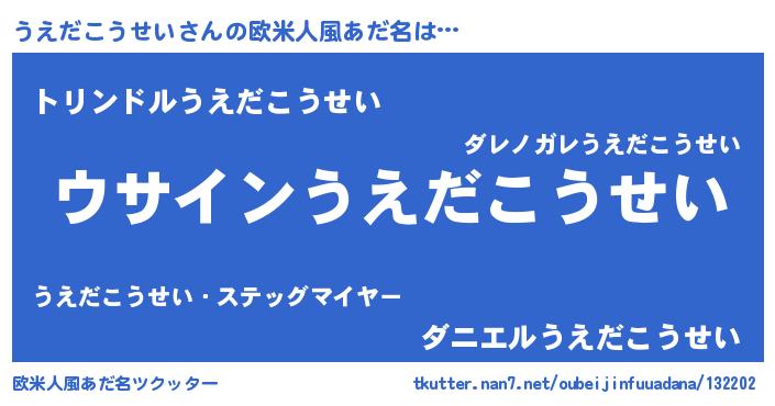 | 女子向けラノベタイトル風あだ名 | 『うえだこうせいの卵を拾いまして』 |