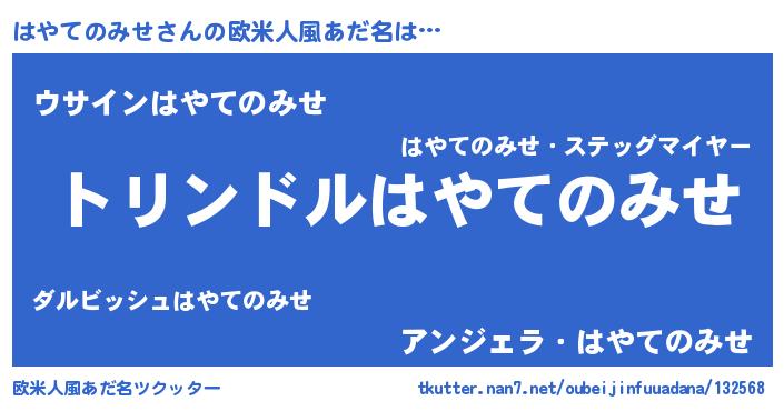 | 女子向けラノベタイトル風あだ名 | 『はやてのみせの玉の輿計画!』 |