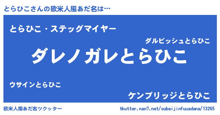 | 男性向けラノベタイトル風あだ名 | 『この素晴らしい世界にとらひこを!』 |