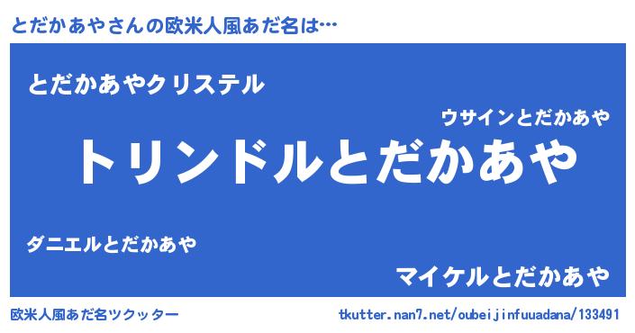 | 男性向けラノベタイトル風あだ名 | 『とだかあや~年齢イコール彼女いない歴の魔法使い~』 |