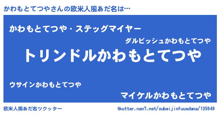 男性向けラノベタイトル風あだ名 | 『転生したらかわもとてつやだった件』 |
