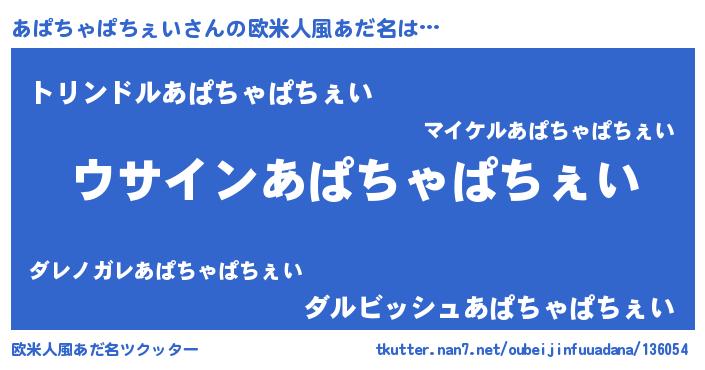 | 男性向けラノベタイトル風あだ名 | 『あぱちゃぱちぇいの嫁は女の子じゃないと思った?』 |