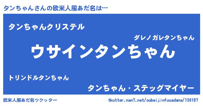 | 男性向けラノベタイトル風あだ名 | 『タンちゃんの嫁は女の子じゃないと思った?』 |