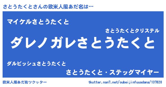 | 男性向けラノベタイトル風あだ名 | 『この素晴らしい世界にさとうたくとを!』 |