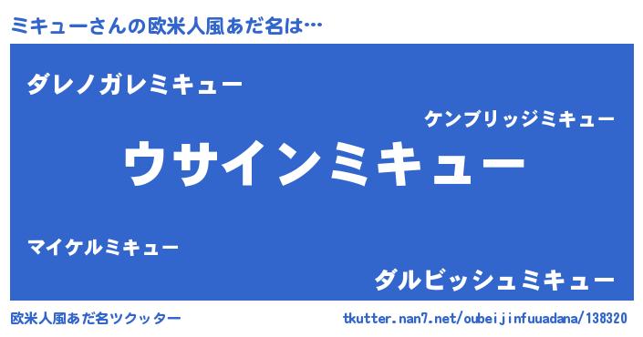 | 男性向けラノベタイトル風あだ名 | 『ミキューの嫁は女の子じゃないと思った?』 |