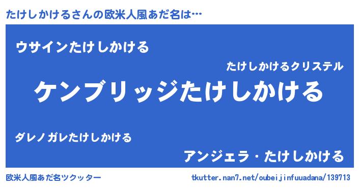 | 男性向けラノベタイトル風あだ名 | 『Re:たけしかけるから始める異世界生活』 |