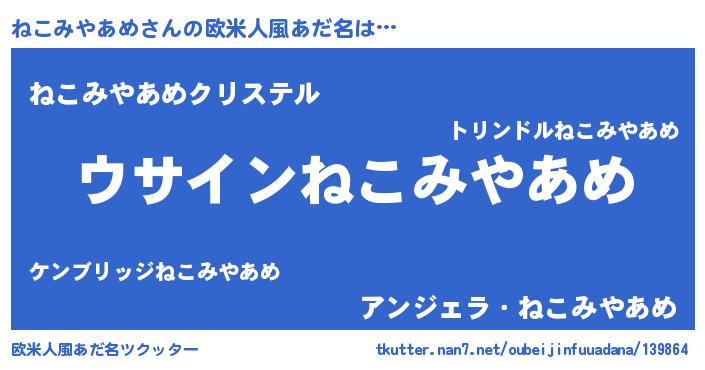 | 男性向けラノベタイトル風あだ名 | 『ねこみやあめの嫁は女の子じゃないと思った?』 |