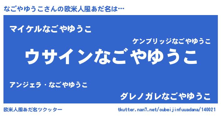| 男性向けラノベタイトル風あだ名 | 『なごやゆうこの嫁は女の子じゃないと思った?』 |