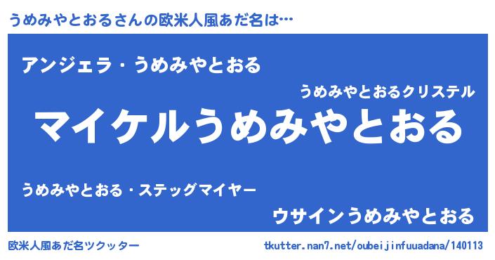 | 男性向けラノベタイトル風あだ名 | 『ウメミヤトオルアートオンライン』 |