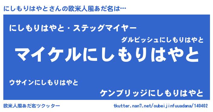 | 男性向けラノベタイトル風あだ名 | 『にしもりはやとの憂鬱』 |