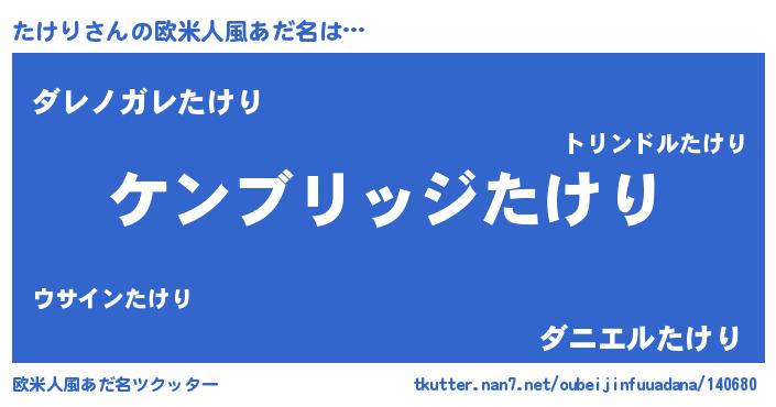 | 男性向けラノベタイトル風あだ名 | 『Re:たけりから始める異世界生活』 |