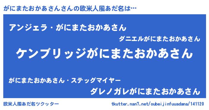 | 意味不明あだ名 | 『自称がにまたおかあさん』 |