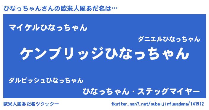 | 男性向けラノベタイトル風あだ名 | 『Re:ひなっちゃんから始める異世界生活』 |
