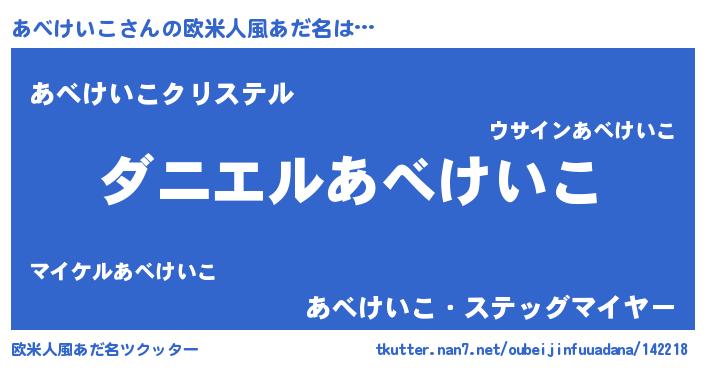 | 男性向けラノベタイトル風あだ名 | 『おまえをオタクにしてやるから、俺をあべけいこにしてくれ! 』 |