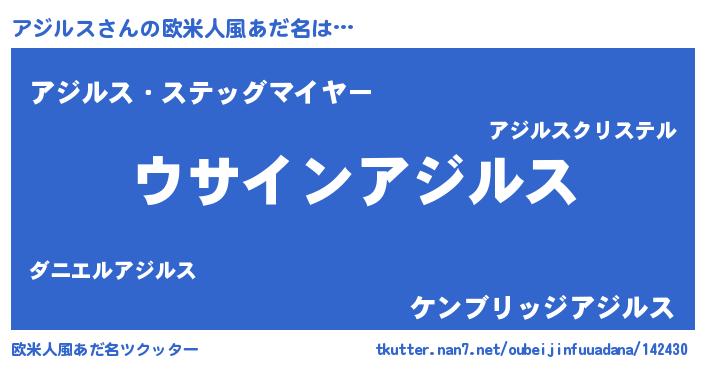 | 男性向けラノベタイトル風あだ名 | 『アジルスの嫁は女の子じゃないと思った?』 |