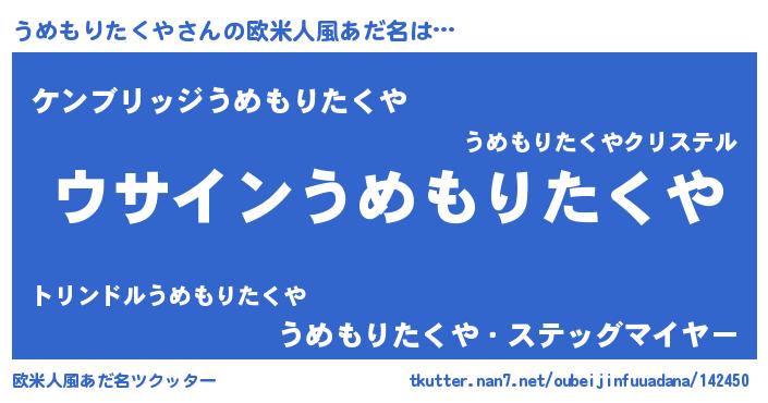 | 男性向けラノベタイトル風あだ名 | 『うめもりたくやの嫁は女の子じゃないと思った?』 |