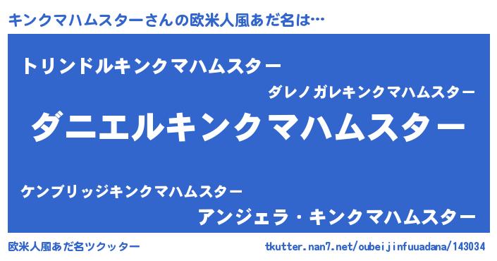 | 男性向けラノベタイトル風あだ名 | 『ノーゲーム・ノーキンクマハムスター』 |