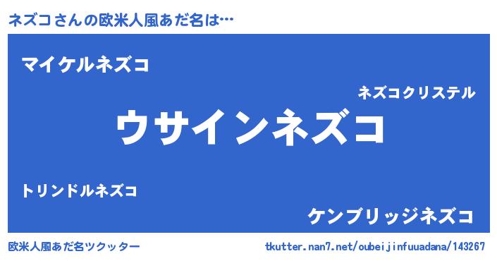 | 女子向けラノベタイトル風あだ名 | 『ネズコの卵を拾いまして』 |