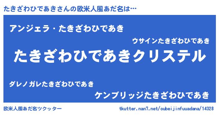| 男性向けラノベタイトル風あだ名 | 『やはりたきざわひであきの青春ラブコメはまちがっている 』 |