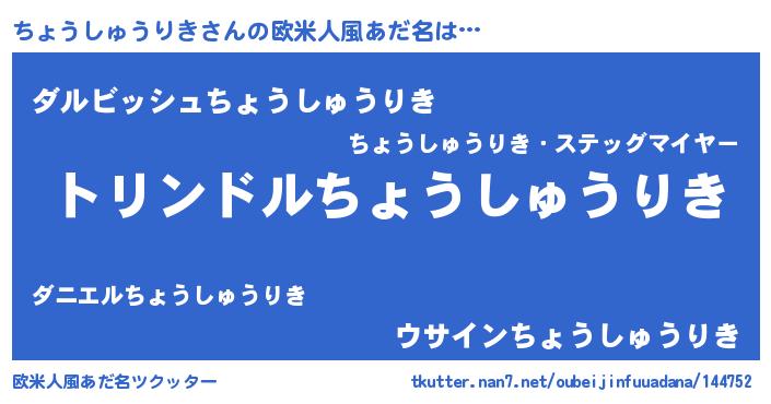 | 女子向けラノベタイトル風あだ名 | 『ちょうしゅうりきの玉の輿計画!』 |