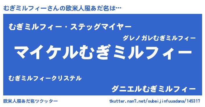 | 男性向けラノベタイトル風あだ名 | 『むぎミルフィーの憂鬱』 |