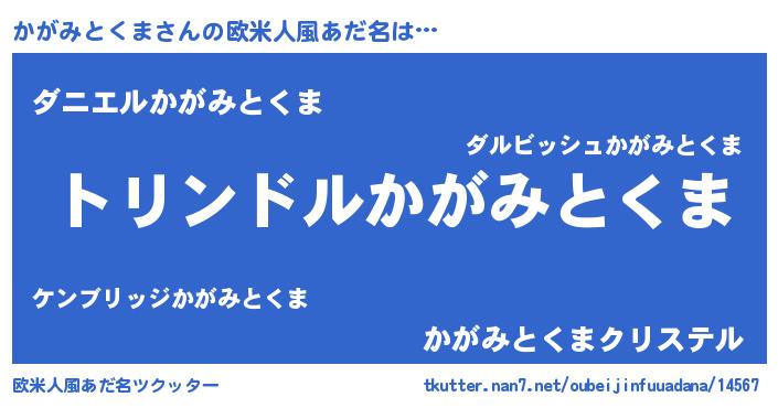 | 男性向けラノベタイトル風あだ名 | 『かがみとくま~年齢イコール彼女いない歴の魔法使い~』 |