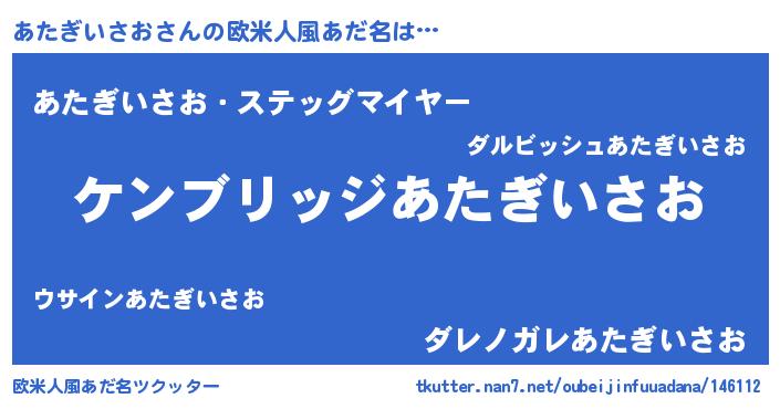 | 男性向けラノベタイトル風あだ名 | 『Re:あたぎいさおから始める異世界生活』 |