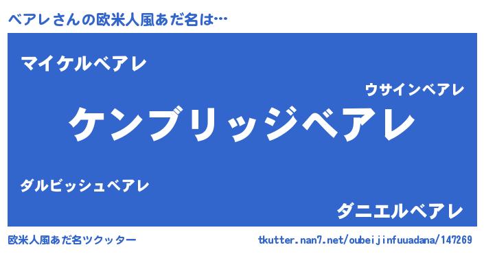 | 男性向けラノベタイトル風あだ名 | 『Re:べアレから始める異世界生活』 |