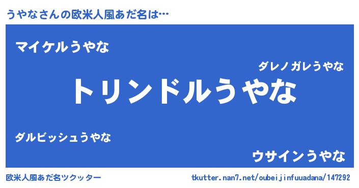 | 男性向けラノベタイトル風あだ名 | 『うやな~年齢イコール彼女いない歴の魔法使い~』 |