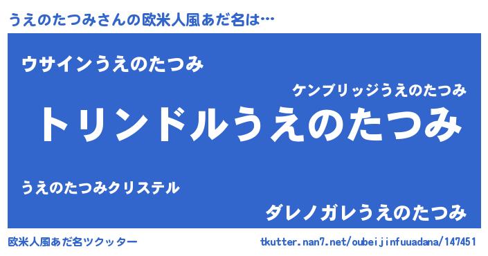 | 男性向けラノベタイトル風あだ名 | 『転生したらうえのたつみだった件』 |